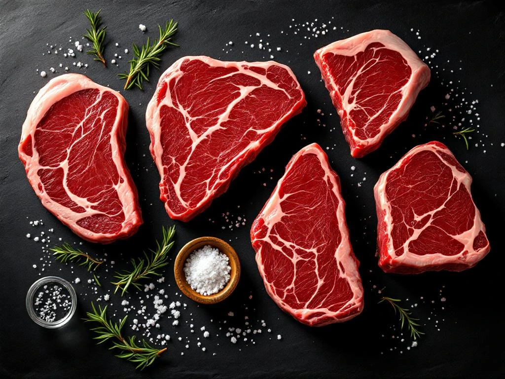 Look for marbling (white fat veins through the meat), a bright red color without brown spots, and a firm texture that springs back when touched. Quality meat has a dry, non-sticky surface and a fresh smell. With dry-aged meat, a darker color and nutty aroma are normal.